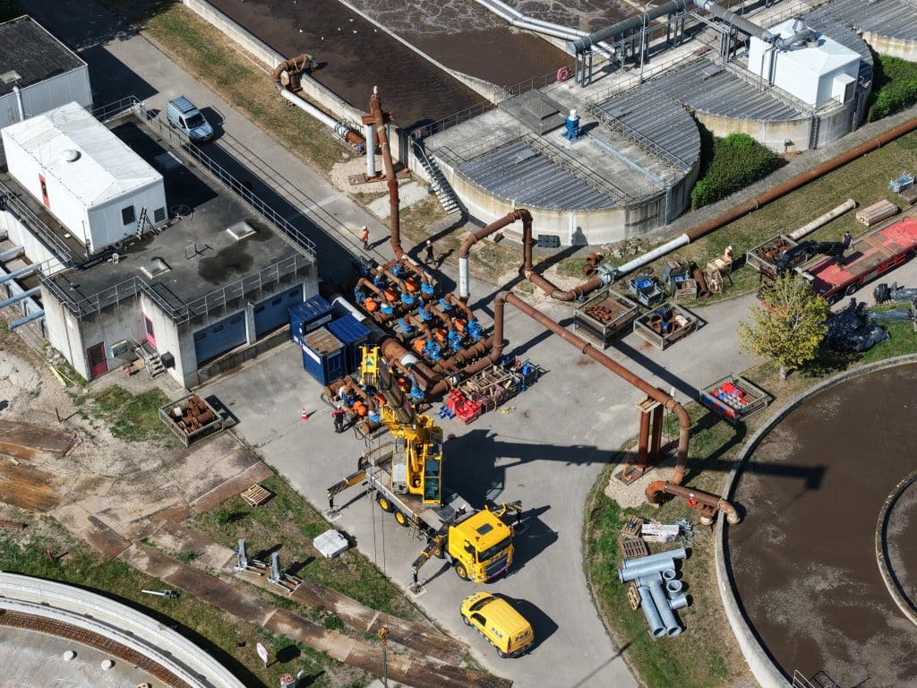 De hoofdaannemer schakelde Vanderkamp in voor deze belangrijke klus. Dat bedrijf heeft zich gespecialiseerd in tijdelijke pompinstallaties voor zuiveringen en oppervlaktewater. Projectleider Michiel Sieders: ‘Wij gaan altijd eerst goed naar de vraagstelling kijken. Dit was niet simpelweg een kwestie van wat pompen neerzetten. Het water moest heel specifiek verdeeld worden over drie beluchtingstanks: twee van 30 procent en één van 40 procent.’